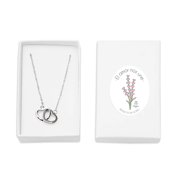 Delicado collar de acero quirúrgico con dije de dos corazones con strass enlazados 💕. Un accesorio hipoalergénico y resistente al agua que simboliza unión y amor eterno. Viene presentado en una cajita de cartón reutilizable con un sticker exclusivo con la frase “El amor nos une”. Es el detalle perfecto para transmitir cariño y conexión en cualquier momento del año.