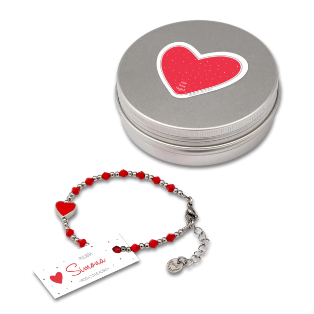Pulsera de acero con cristales facetados rojos que aportan un toque vibrante y cuentas de acero que realzan su sofisticación. En el centro, un dije en forma de corazón 💖, también de acero, simbolizando el amor. Viene en una lata reutilizable, perfecta para regalar o mantener tus accesorios organizados. 🎁