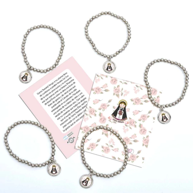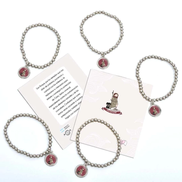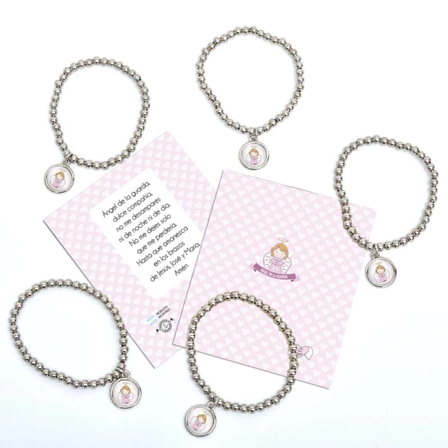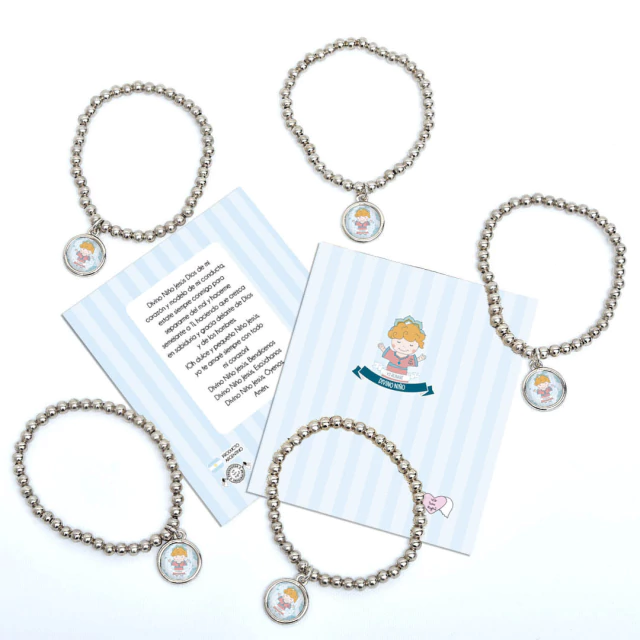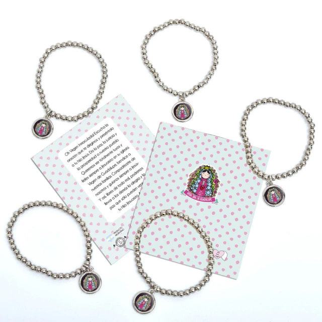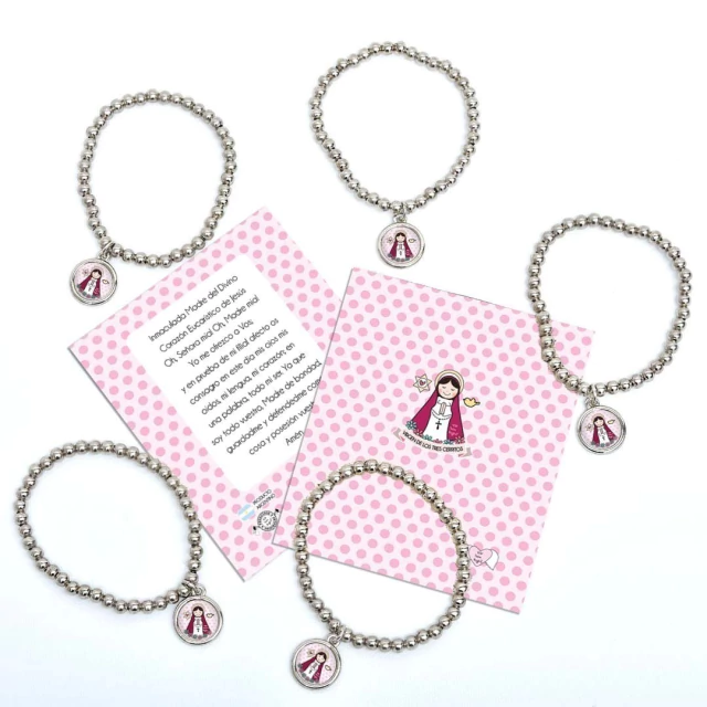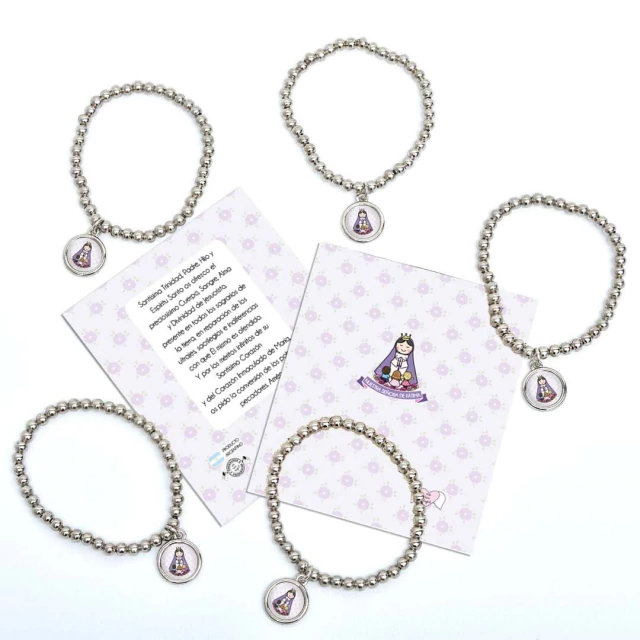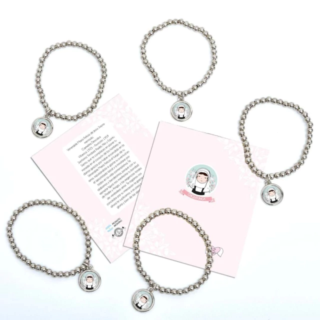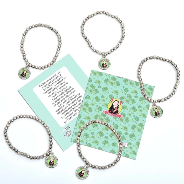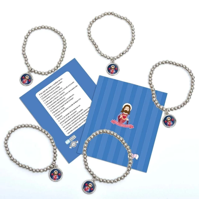 Pack x10 unidades pulsera Xfis que incluye pulsera elastizada de aleación de metales + tarjeta con oración + bolsita de PVC.