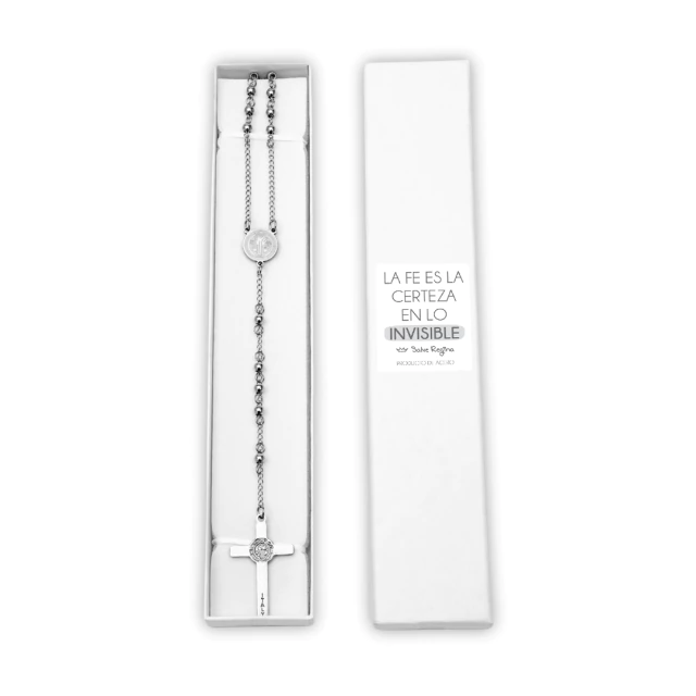 Rosario largo de acero con cuentas medianas todo de acero con centro y cruz de San Benito. Una opción clásica y unisex.