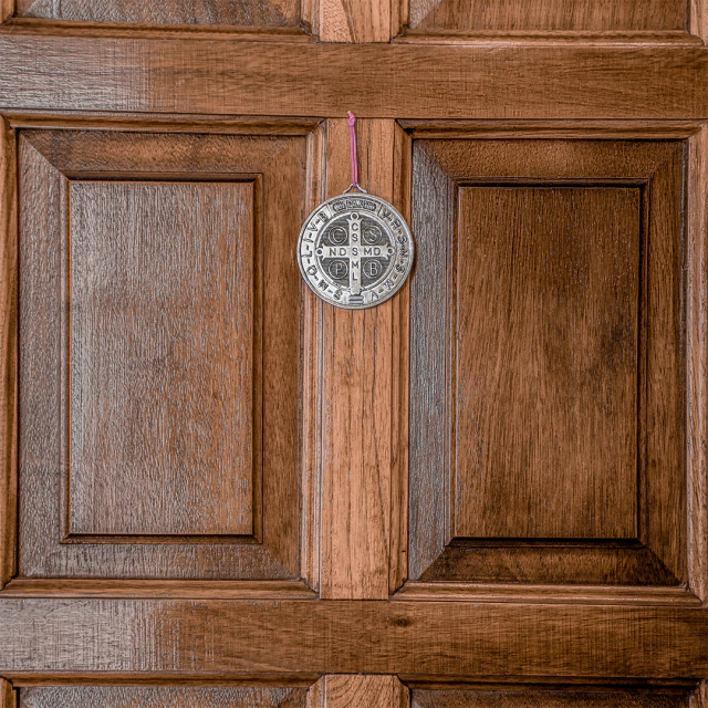 Medallón de metal con la cruz de San Benito de un lado y la imagen del otro. Ideal para colgar en la puerta.