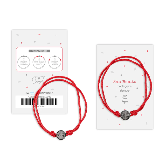 Pulsera de hilo rojo regulable con dije de San Benito en acero quirúrgico.