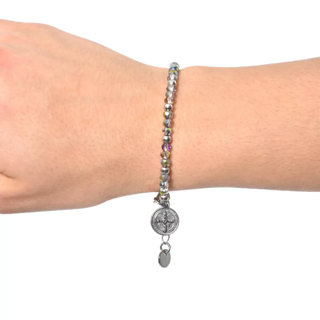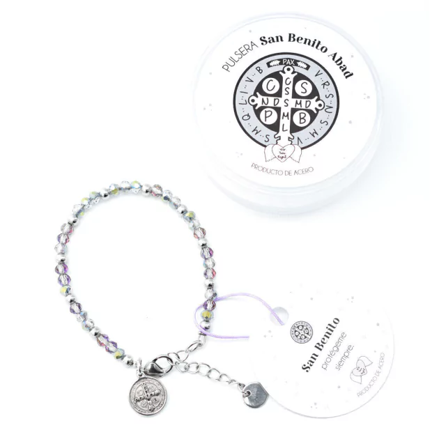 Adentrate en la esencia de la protección con nuestra pulsera de cuentas de acero y cristal, acompañada de un dije de acero con la imagen de San Benito en un lado y la cruz en el otro.