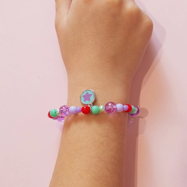 Pulsera elastizada con cuentas de acrílico en tonos vibrantes: lila, rojo y verde agua. Incluye una medalla con dome con estrella violeta y viene presentada con una tarjeta con diseño exclusivo. Además, tiene un sticker con la frase “El verdadero tesoro está en ser quien sos” ✨. Un detalle lleno de color y personalidad, ideal para regalar autenticidad y alegría desde los primeros años 💖