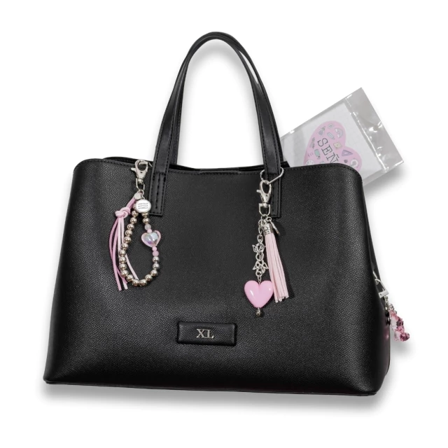 Charm o bendición para bolso súper en tendencia, con cuentas metálicas, acrílicos en tonos celestes o rosas, un corazón y cintas de gamuza a tono.