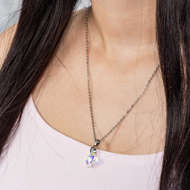 Collar de cadena bien finita con una cruz de cristal con aurora boreal.